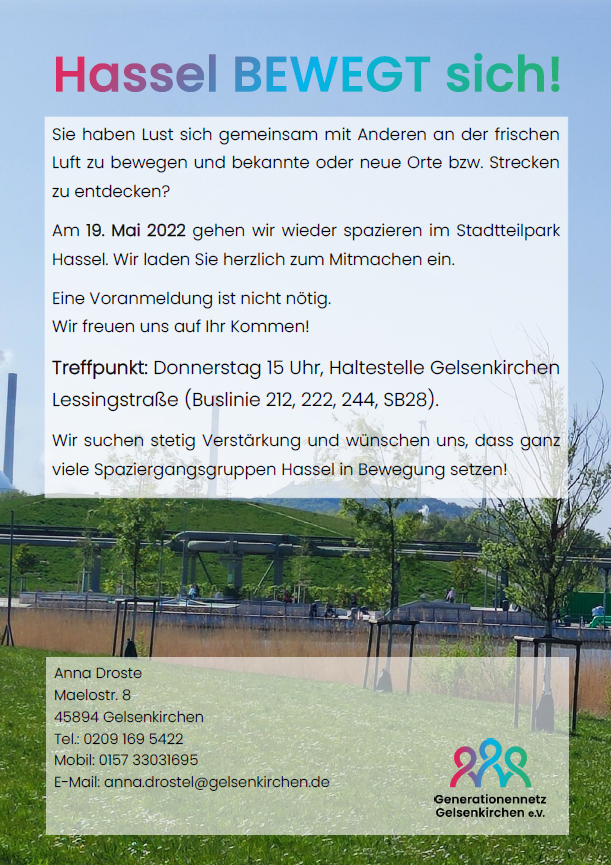 Wir freuen uns auf viele weitere Spaziergänge durch den Stadtteil, um gemeinsam bekannte, aber auch neue Orte und Strecken kennenzulernen. Wir freuen uns auch auf Verstärkung und wünschen uns, dass ganz viele Spaziergangsgruppen Hassel in Bewegung setzen!