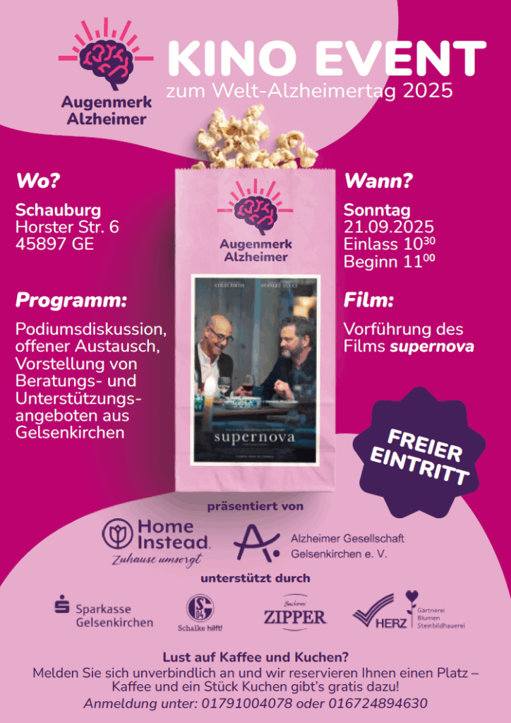 Am 21. September 2025 ist Welt-Alzheimertag. Auch dieses Jahr laden Home Instead Gelsenkirchen und die Alzheimer Gesellschaft Gelsenkirchen e.V. erneut zu einem besonderen Kinoerlebnis ein: