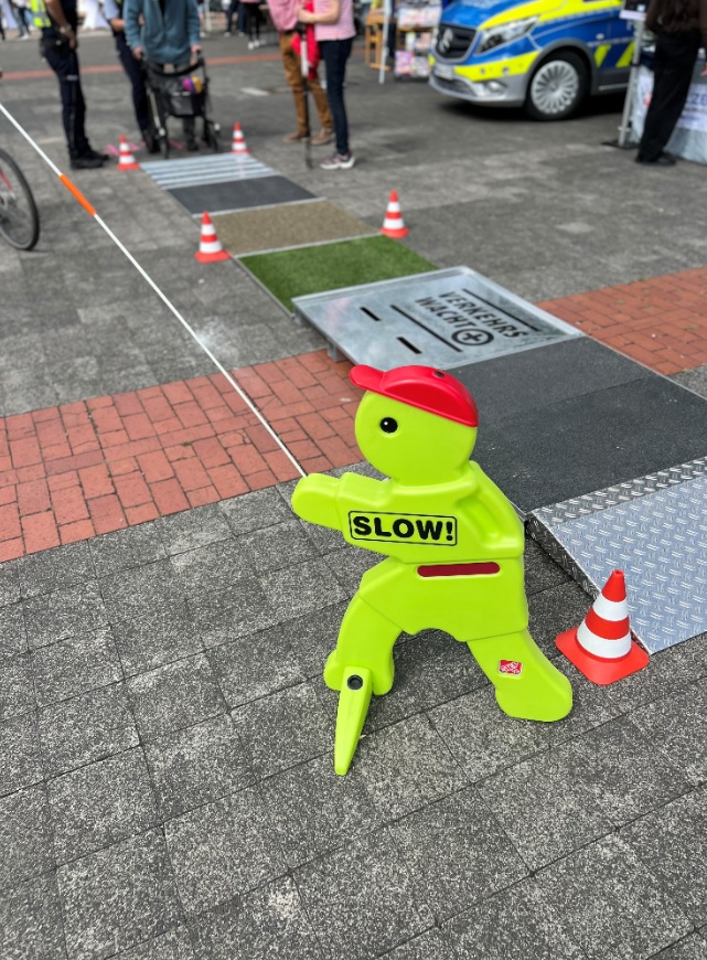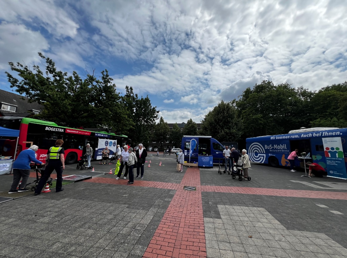 Als zentraler Akteur zum Thema „Mobilität“ war die BoGeStra samt Linienbus vor Ort, um zusammen mit interessierten Bürger:innen ein Rollatortraining durchzuführen. Damit das Bremsen, Drehen und Manövieren Betroffenen nicht nur im ÖPNV leichter fällt, konnten beim Hindernis-Parcours der Gelsenkirchener Verkehrswacht weitere Herausforderungen angenommen und Hindernisse bewältigt werden.